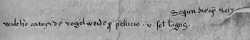 Wolfger's episcopal travel accounts provide the only contemporary reference to the famous Minnesänger Walther von der Vogelweide outside of the Minnesang itself. He may also have been the patron of the author of the Middle High German Nibelungenlied, since a fictional bishop of Passau plays a prominent role in it.[3] The poet Albrecht von Johansdorf was also associated with his court.[1] The jurist Eilbert of Bremen dedicated his Ordo iudiciarius to Wolfger.[4]