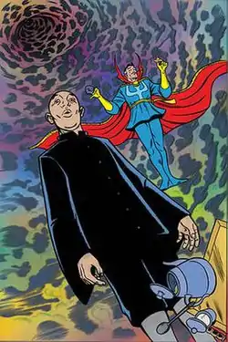 Wong and the empath, Topaz, were both abducted to another planet by the alien sorcerer, Urthona, when the latter used his magical powers to steal Doctor Strange's house and the mystical talismans and books it contained. Urthona even viciously mutilated Wong's face while holding him prisoner.[5] Strange defeated Urthona and rescued Wong and Topaz. Back on Earth, Topaz used her healing powers to restore Wong's face to normalcy.