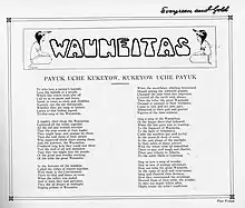 The name, culture, and traditions of the Wuaneita Society are heavily appropriated from stereotypes of Cree culture; the women often called themselves "Tribe Wuaneita".[3] The name Wuaneita is a rough equivalent to the Cree word meaning "kind-hearted".[2] Initiation ceremonies featured First Nations accoutrements like feathers and headdresses, and initiates were welcomed using a "blanket of friendship" that would be draped over each woman's shoulders by the "Big Chief," the society president.[2] The motto of the group was "payuk uche kukeyow, mena kukeyow uche payuk," a rough translation into Cree of "all for one, one for all" that is still engraved above the outer doors of Pembina Hall on main campus.[7]