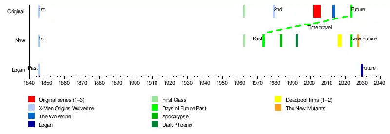 The events of the films are separated into two "timelines"; the original timeline and the new timeline.[130][131] The setting of Logan was initially implied by Hugh Jackman to be set in an alternate timeline and not following the prequel films, before director James Mangold stated that it was related;[132][133] Marvel later officially classified the film as a separate universe from the film series in the Official Handbook of the Marvel Universe A-Z. Within the Marvel multiverse, the original timeline was officially designated as Earth-10005, the events of Deadpool 2 as Earth-41633, the events of Logan as Earth-17315, while the new timeline, consisting of the prequel films, Deadpool and The New Mutants remains undesignated.[134]