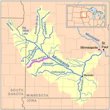 The Yellow Medicine River is a tributary of the Minnesota River, 107 miles (172 km) long, in southwestern Minnesota in the United States. Via the Minnesota River, it is part of the watershed of the Mississippi River, draining an area of 665 square miles (1,720 km2) in an agricultural region.