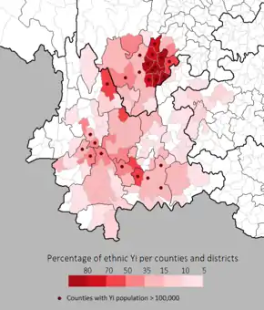 Beginning with the Ming dynasty, the Chinese empire expedited its cultural assimilation policy in Southwestern China, spreading the policy of gaitu guiliu (改土歸流, 'replacing tusi (local chieftains) with "normal" officials').[17] The governing power of many Yi feudal lords had previously been expropriated by the successors of officials assigned by the central government. With the progress of gaitu guiliu, the Yi area was dismembered into many communities both large and small, and it was difficult for the communities to communicate with each other as there were often Han-ruled areas between them.