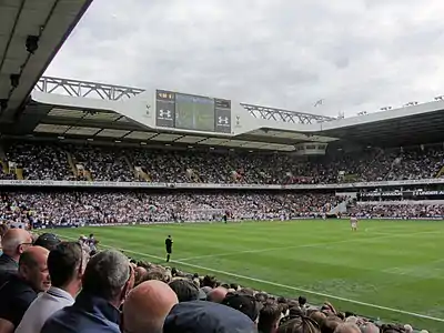 Tottenham Hotspur were formed by a group of schoolboys, and those who attended their matches in the early days were likely to be friends and families.[31] Their matches soon attracted the attention of the locals in the growing suburbs of Tottenham, and the first competitive game by Tottenham in 1885 recorded a figure of 400 spectators. Within a few years the home matches of the club drew crowds of up to 4,000, although these were non-paying spectators as they played on public ground at that time. Tottenham moved to an enclosed ground at Northumberland Park where they can charge an entrance fee in 1888, and joined the Southern League in 1896. In their first few years in the league, the attendance averaged at around 2,000.[32] A United League match against Arsenal in 1898 drew 14,000 spectators, and such high attendances necessitated a move to a larger ground.[33]