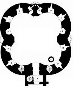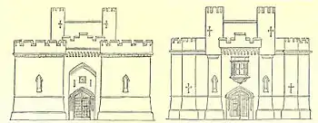 Clifford's Tower is of an unusual design. The two-storey tower has a quatrefoil plan with four circular lobes. Each lobe measures 22 ft (6.7 m) across, with walls 9 ft 6 in (2.90 m) thick; at its widest, the tower is 79 ft (24 m) across.[42] A square gatehouse, 21 ft (6.4 m) wide, protected the entrance on the south side between two of the lobes.[42] There are defensive turrets between the other lobes.[42] Large corbels and a central pier supported the huge weight of stone and the first floor.[43] Loopholes of a design unique to York Castle provided firing points.[44] A chapel was built over the entrance, measuring 15 by 14 ft (4.6 by 4.3 m) doubling as a portcullis chamber as at Harlech and Chepstow Castles.[45] The tower is believed to be an experiment in improving flanking fire by making more ground visible from the summit of the keep. Although unique in England, the design of the tower closely resembles that at Étampes in France, and may have influenced the design of the future keep of Pontefract Castle.[46] Henry employed master mason Henry de Rayns and chief carpenter Simon of Northampton for the project, and the cost of the tower accounted for the majority of the overall expenditure on the castle during this period of work.[47]