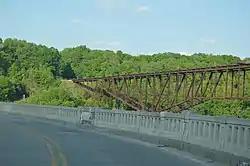 Young's High Bridge, also known as the Jo Blackburn Bridge, is a former railroad bridge near Tyrone, Kentucky, USA, that spans the Kentucky River between Anderson County, Kentucky and Woodford County, Kentucky for the Louisville Southern Railroad.[1] The cantilever bridge, named in honor of William Bennett Henderson Young, was constructed in 1889, and the first train crossed over on August 24, 1889. The bridge is 1,659 feet in length, is 283 feet above the river, and includes a 551 foot long cantilever span.[2]