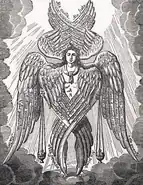 After the point of light, a figure with twelve wings on a red background, similar to some representations of cherubic angels, appears.[172][174] This is followed by a celestial flame, which refers to the concept of the soul or "life breath" and which plays a role in the series.[175][176] The image also depicts the first light seen by a newborn child.[177] Further religious symbolism consists of a dual depiction of the Kabbalistic tree of life,[178][179] in reference to the series' Human Instrumentality Project,[180] a plan for the evolution of humanity pursued by the character of Gendo Ikari.