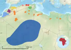 The Sanhaja (Berber languages: Aẓnag, pl. Iẓnagen, and also Aẓnaj, pl. Iẓnajen; Arabic: صنهاجة, Ṣanhaja or زناگة Znaga) were once one of the largest Berber tribal confederations, along with the Zanata and Masmuda confederations.[1] Many tribes in Algeria, Burkina Faso, Libya, Mali, Mauritania, Morocco, Niger, Senegal, Tunisia and Western Sahara bore and still carry this ethnonym, especially in its Berber form. Other names for the population include Zenaga, Znaga, Sanhája, Sanhâdja and Senhaja.